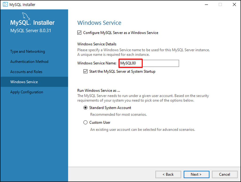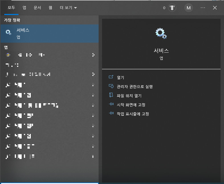 3. mysql 서비스 실행 여부를 확인한다. [시작] - [서비스] - 서버 설치 시 설정해 준 윈도우 서비스 명칭 확인 (MySQL80)