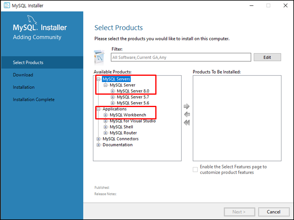 2. 다운로드한 Installer를 통해 MySQL Server와 MySQL Workbench를 다운로드해준다.
