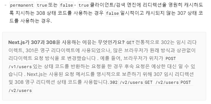 redirect : 특정 url을 입력했을 때 지정된 다른 url로 이동시키는 기법 rewrite : redirect와 같은 역할을 하지만 사용자에게 url의 변경을 알리지 않고 내부적으로 이동시키는 기법 NextJs 프로젝트를 생성하고 next.config.js 파일을 보면 버전에 따라 차이는 있겠지만 아래와 같은 형태로 파일이 존재할 것이다. /** @type {import('next').NextConfig} */ const nextConfig = { reactStrictMode: true, } module.exports = nextConfig 첫째로 redirect 기능을 사용하기 위해서 nextConfig 안에 redirects라는 함수를 추가해 주어야 한다. /** @type {import('n..